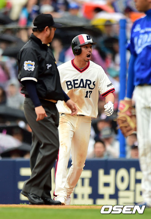 6회말 1사 두산 오재원이 3루 앞 땅볼때 1루에서 아웃을 당한 뒤 이영재 1루심의 판정에 항의하고 있다.