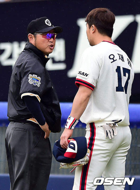 7회초 공수교대때 두산 오재원이 이영재 1루심과 말다툼을 벌이고 있다.
