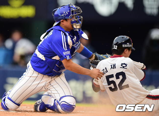 7회말 2사 만루 삼성 이지영이 두산 민병헌의 안타로 홈까지 쇄도하던 김재호를 잡아내고 있다.