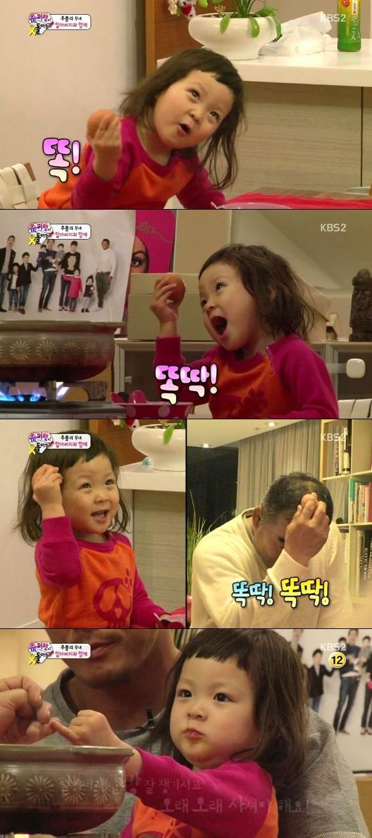 사랑이의 할아버지는 샤브샤브를 먹으며 날달걀을 그릇에 깨뜨리려 했고, 사랑이를 위해서 이마에 깨는 시늉을 했다. 할아버지는 사랑이에게 '똑딱' 소리를 냈고, 사랑이는 이를 따라하며 깜찍한 표정을 지어보였다.