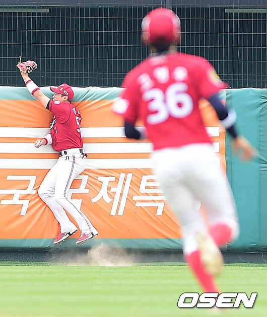 5회말 한화 공격 선두타자로 나선 정근우의 왼쪽 펜스 앞 플라이 타구를 KIA 좌익수 김원섭이 멋지게 점프하며 잡아내고 있다.