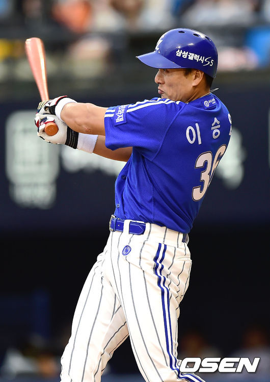 9회초 1사 1,3루 삼성 이승엽이 1타점 적시타를 때리고 있다.