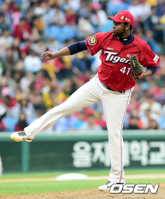 9회말 한화 공격 때 마운드에 오른 KIA 마무리투수 어센시오가 힘차게 공을 뿌리고 있다.