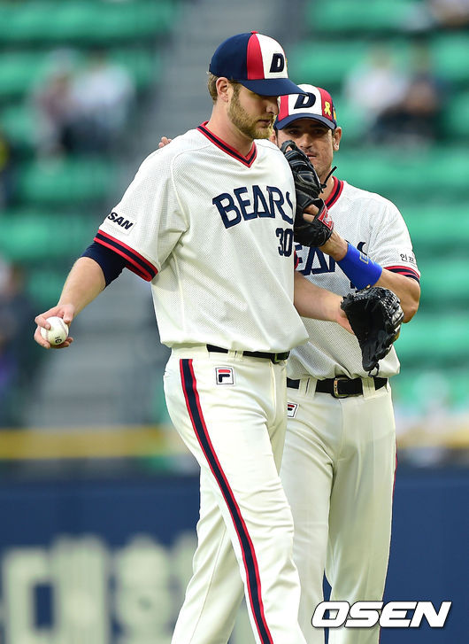 9회초 1사 1,3루 두산 칸투가 삼성 이승엽에게 적시타를 허용해 완봉승이 깨진 볼스테드를 격려하고 있다.