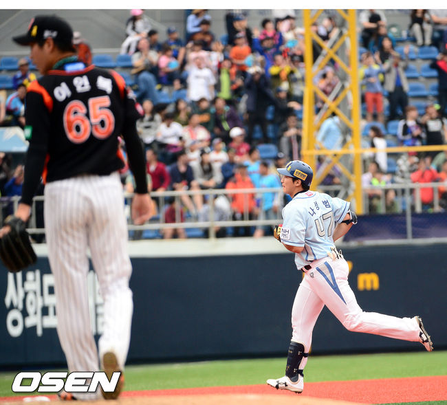 11일 오후 경남 창원 마산구장에서 열린 '2014 한국야쿠르트 세븐 프로야구' NC 다이노스와 롯데 자이언츠의 경기, 8회말 2사 1,3루 스리런을 날린 나성범이 그라운드를 돌고 있다.