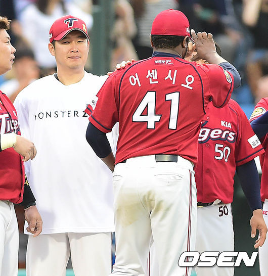 승리투수가 된 KIA 송은범이 마무리투수 어센시오와 인사를 나누고 있다./dreamer@osen.co.kr