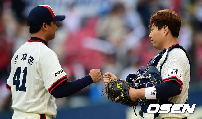 승리를 거둔 두산 정재훈과 양의지가 세레머니를 하고 있다./youngrae@osen.co.kr