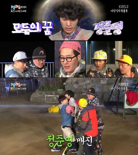 정준영은 11일 오후 6시 5분 방송된 KBS 2TV '해피선데이-1박 2일'에서 저녁 복불복 팀 짜기에서 모두가 원하는 멤버로 꼽혔다.