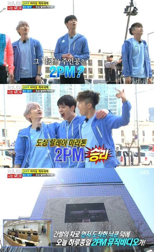 2PM은 11일 오후 방송된 SBS 예능프로그램 '일요일이 좋다-런닝맨'(이하 '런닝맨')에서 2NE1이 속한 YG엔터테인먼트 팀, 윤종신-뮤지-조정치 등이 속한 미스틱89팀을 누르고 1라운드에서 승리했다.