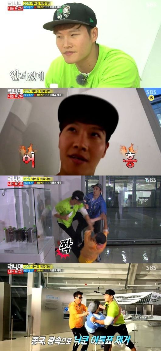 김종국은 11일 오후 방송된 SBS 예능프로그램 '일요일이 좋다-런닝맨'(이하 '런닝맨')에서 수세가 밀리자 호랑이 '포스'를 내뿜으며 닉쿤, 하하와 이름표 떼기 대결을 펼쳤다.