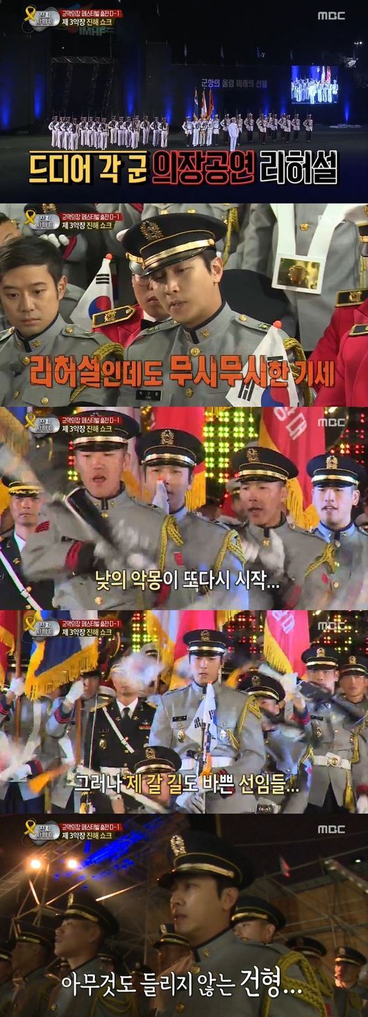 11일 오후 방송된 MBC 예능프로그램 '일밤-진짜사나이'(이하 '진짜사나이')에서는 군악의장 공연을 앞두고 리허설에서 갑자기 자신감을 잃고 틀리기 시작하는 박건형의 모습이 그려졌다.