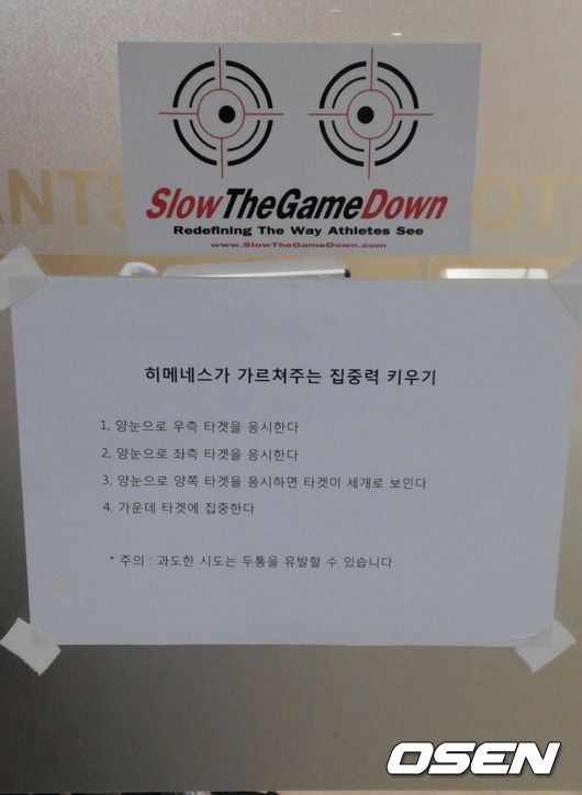 이제는 이 표적이 아예 사직구장 트레이닝실 입구에 붙어 있다. '히메네스가 가르쳐주는 집중력 키우기'라는 글과 함께 그 방법이 상세하게 쓰여 있다. 방법은 이렇다. 일단 양눈으로 우측 타겟을 응시하고 그 뒤 양눈으로 좌측 타겟을 본다. 그리고 두눈으로 양쪽 타겟을 응시하면 타겟이 세개로 늘어나는데, 이때 가운데 타겟에 집중하면 된다.