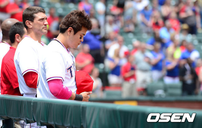 12일(이하 한국시각) 미국 텍사스주 알링턴 글로브 라이프 파크에서 열린 '2014 메이저리그' 텍사스 레인저스와 보스턴 레드삭스의 경기 시작전 구장에 미국 국가가 나오는 가운데, 추신수가 고개를 숙이고 생각에 잠겨 있다.