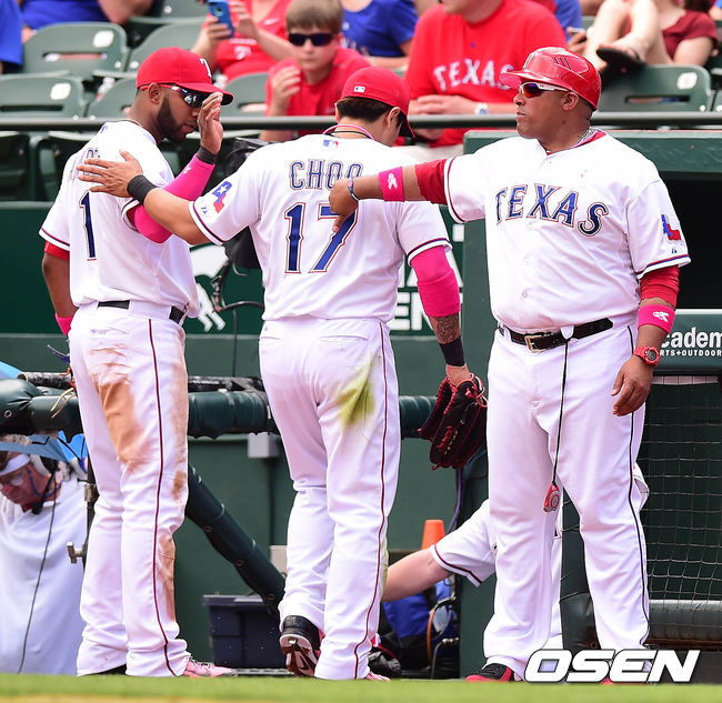 12일(이하 한국시각) 미국 텍사스주 알링턴 글로브 라이프 파크에서 열린 '2014 메이저리그' 텍사스 레인저스와 보스턴 레드삭스의 경기 3회초 종료 후 추신수가 덕아웃으로 향하며 몰리나 코치(오른쪽)와 앤드루스의 격려를 받고 있다.
