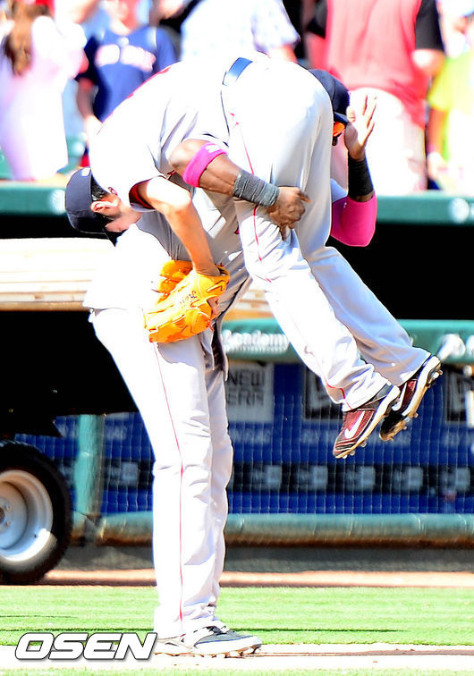 12일(이하 한국시각) 미국 텍사스주 알링턴 글로브 라이프 파크에서 열린 '2014 메이저리그' 텍사스 레인저스와 보스턴 레드삭스의 경기 종료 후 데이빗 오티스가 우에하라를 들고 엉덩이를 치고 있다.