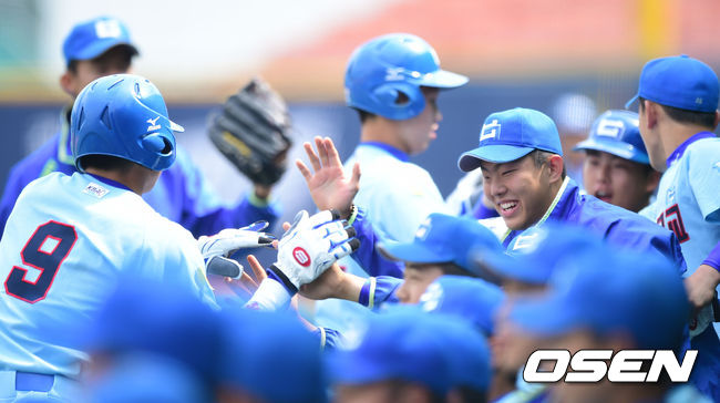 1회초 무사 1,2루 부산고 명건우의 적시타로 득점을 올린 부산고 선수들이 기뻐하고 있다.