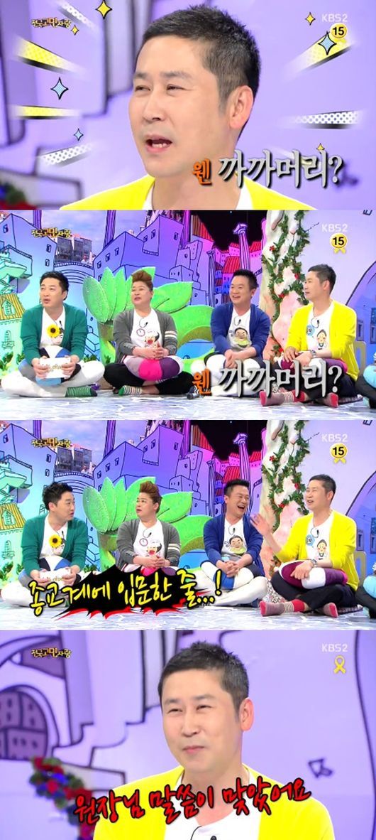 신동엽은 12일 오후 방송된 KBS 2TV '대국민 토크쇼 안녕하세요'에서 짧은 까까머리로 등장해 모두의 관심을 한 몸에 받았다.
