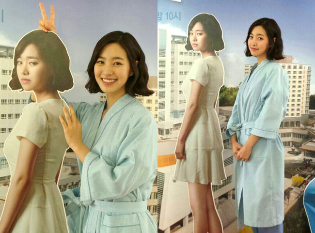 사진은 인천의 한 병원에 진열돼 있는 진세연 실물크기 판넬. 진세연은 실물크기의 판넬에 장난스러운 브이를 하고, 옆에 나란히 서서 다소곳한 포즈를 취하고 있다.