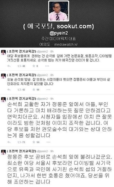 그는 "손석희 교활한 자가 정몽준 앞에서 아들, 부인 다 거론하고 마치 배려하는듯 질문 안하겠다고 연막치더라"면서 "시청자들 입장에선 마치 큰 잘못이라도 범한 것처럼 이미지 조작한 겁니다. 여당 후보들 저런 권모술수의 대가와는 상대 안하는게 몸 성할겁니다"라고 적었다.