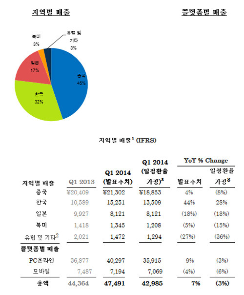 글로벌 온라인 게임업체 넥슨 일본법인(이하 넥슨)은 13일 자사의 2014년 1분기 연결 실적을 발표했다.