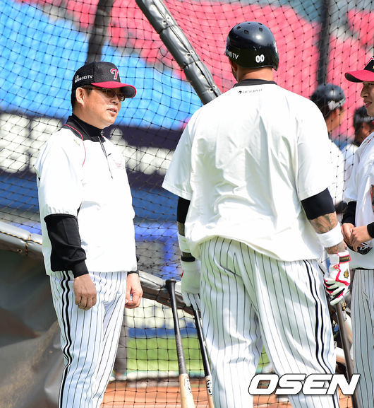 경기에 앞서 LG 양상문 감독이 타격 훈련 중인 조쉬벨과 이야기를 나누고 있다.