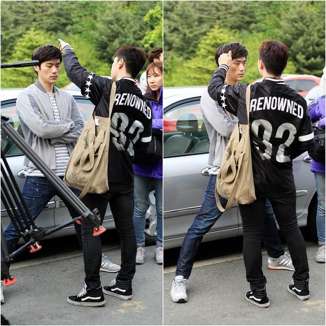 공개된 스틸 속 김강우는 자신의 머리 매무새를 만져주고 있는 스태프와 눈높이를 맞추기 위해 다리를 벌려 키를 낮춘 '매너다리'를 선보이고 있다. 무심한 듯 보이는 표정 속에서도 스태프를 배려하는 센스 넘치는 김강우의 매너다리가 보는 이들의 미소를 자아내게 만든다.