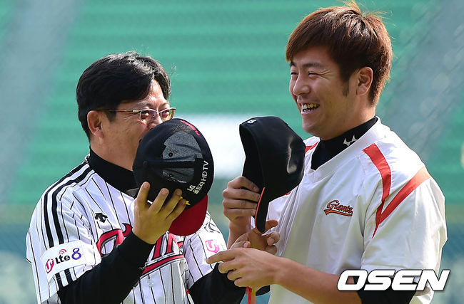 경기에 앞서 롯데 강민호가 LG 양상문 감독과 인사를 하며 미소짓고 있다.