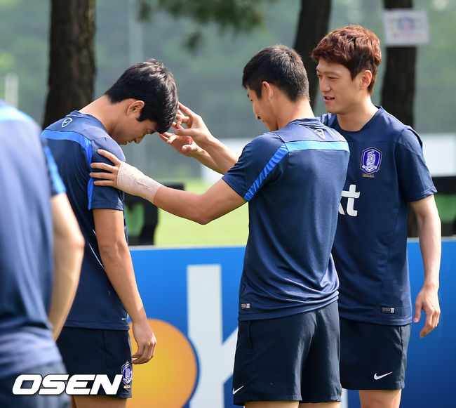 박주영이 파주 NFC에서 훈련 중 이근호와 이청용에게 딱밤을 맞고 있다.