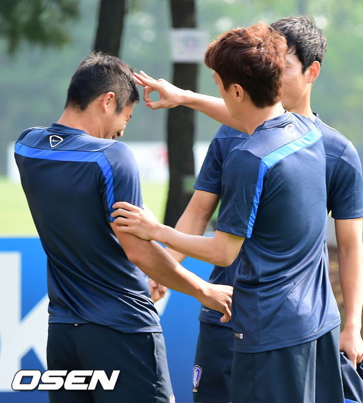 파주 NFC에서 훈련 중 이근호가 이청용과 박주영에게 딱밤을 맞고 있다.