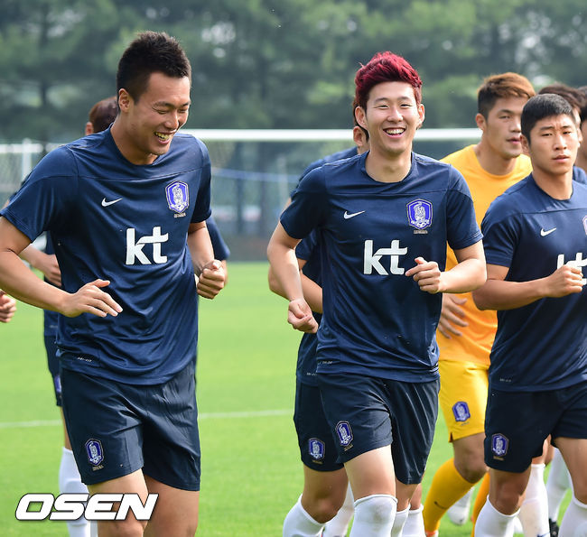 파주 NFC에서 김신욱과 손흥민이 즐겁게 얘기를 나누며 달리기를 하고 있다.
