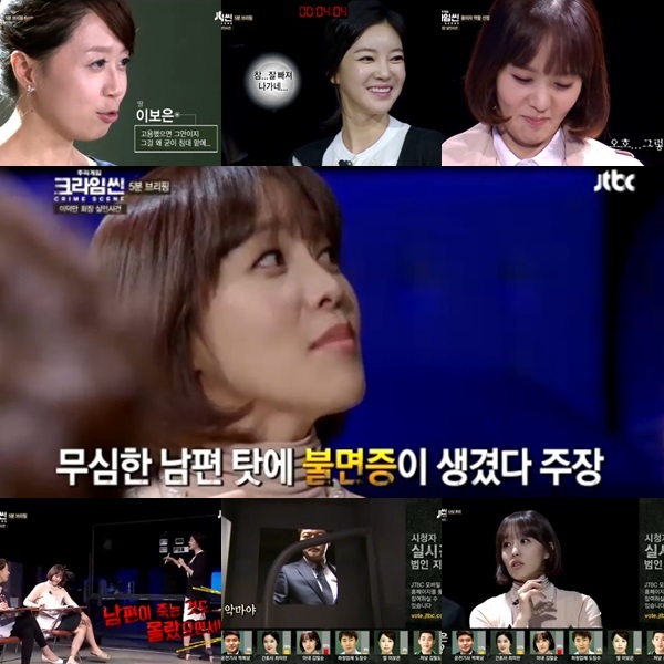 JTBC 추리게임 ‘크라임씬’의 첫 번째 살인사건 진짜 범인은 피해자의 아내 박지윤일까. ‘크라임씬’ 첫 방송에서 유력한 용의자 선상에 오른 인물은 피해자의 가정 간호사 NS윤지. 그러나 방송 후 가장 많이 의심을 받고 있는 사람은 박지윤이다.