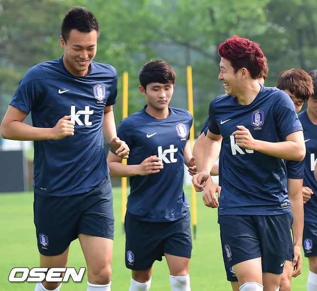 파주 NFC에서 김신욱과 손흥민이 즐겁게 얘기를 나누며 달리기를 하고 있다.