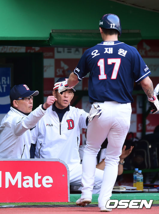 1회초 1사 1,2루 두산 오재원이 칸투의 안타로 득점을 올린 뒤 송일수 감독과 세레머니를 하고 있다.