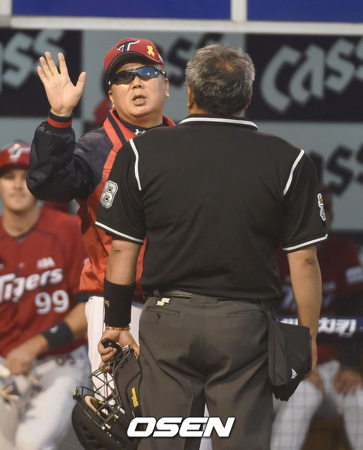 13일 오후 창원시 마산구장에서 열린 '2014 한국야쿠르트 세븐 프로야구' NC 다이노스와 KIA 타이거즈 경기, 3회초 2사 필의 홈런성 타구가 비디오 판독 결과 파울로 인정되자 KIA 선동렬 감독이 김풍기 구심 으로부터 판독 결과에 대해 설명을 듣고 있다.