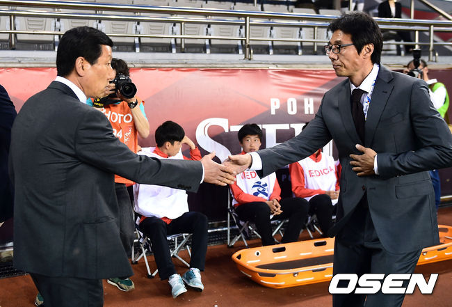 13일 오후 경북 포항시 포항스틸야드에서 진행된 2014 AFC 챔피언스리그 16강 2차전 포항과 전북의 경기에 앞서 전북 최강희 감독과 포항 황선홍 감독이 악수를 나누고 있다.