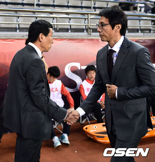 13일 오후 경북 포항시 포항스틸야드에서 진행된 2014 AFC 챔피언스리그 16강 2차전 포항과 전북의 경기에 앞서 전북 최강희 감독과 포항 황선홍 감독이 악수를 나누고 있다.