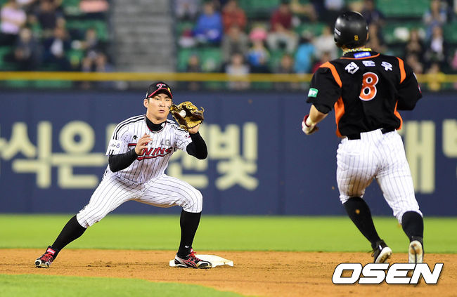 5회초 2사 1루에서 LG 티포드의 견제에 걸린 롯데 1루주자 전준우가 LG 오지환에 의해 태그아웃 되고 있다.