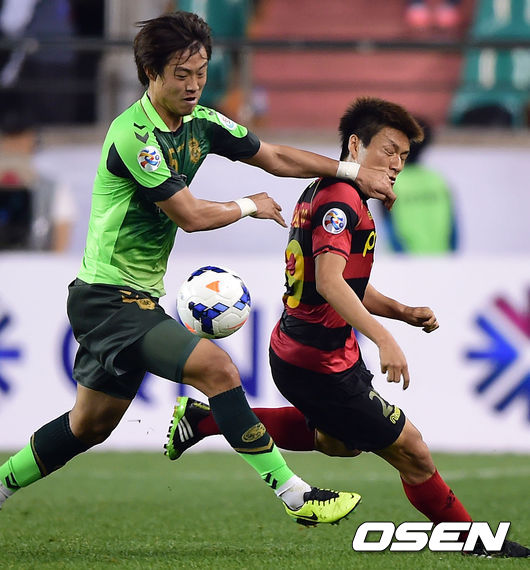 13일 오후 경북 포항시 포항스틸야드에서 진행된 2014 AFC 챔피언스리그 16강 2차전 포항과 전북의 경기, 전반 전북 최보경과 포항 이명주가 몸싸움을 펼치고 있다.