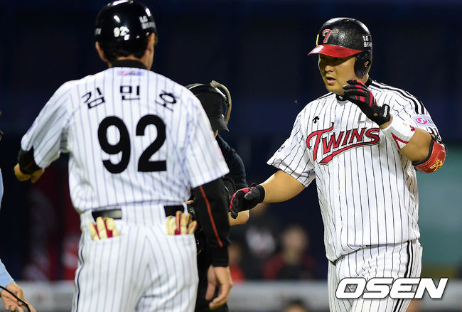 5회말 2사에서 LG 최경철이 좌월 솔로 홈런을 치고 홈에서 김민호 코치와 하이파이브를 하고 있다.