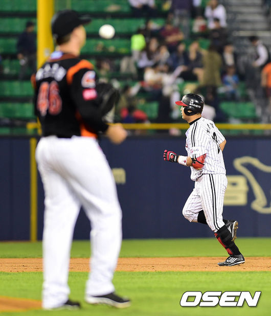 5회말 2사에서 LG 최경철이 좌월 솔로 홈런을 치고 그라운드를 돌고 있다.