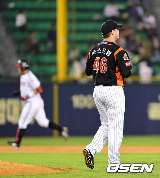 5회말 2사에서 LG 최경철에게 좌월 솔로 홈런을 허용한 롯데 옥스프링이 아쉬운 표정을 짓고 있다.