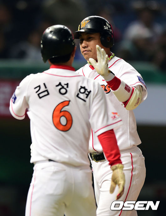 5회말 무사 1루 SK 김강민이 투런 홈런을 때린 뒤 김성현과 하이파이브를 하고 있다.