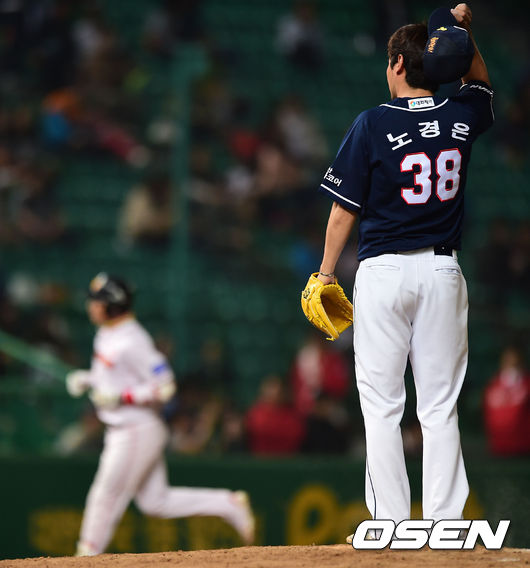 5회말 무사 1루 두산 노경은이 SK 김강민에게 투런 홈런을 허용한 뒤 아쉬워하고 있다.