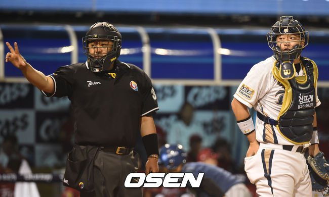 13일 오후 창원시 마산구장에서 열린 '2014 한국야쿠르트 세븐 프로야구' NC 다이와 KIA 타이거즈 경기, 김풍기 구심이 보호장비가 잘 갖추어진 일체형 헬멧을 쓰고 경기를 진행하고 있다.