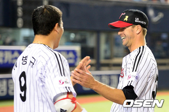 6회초 2사 롯데 박종윤을 삼진으로 처리한 LG 티포드가 더그아웃으로 가며 이병규와 하이파이브를 하고 있다.