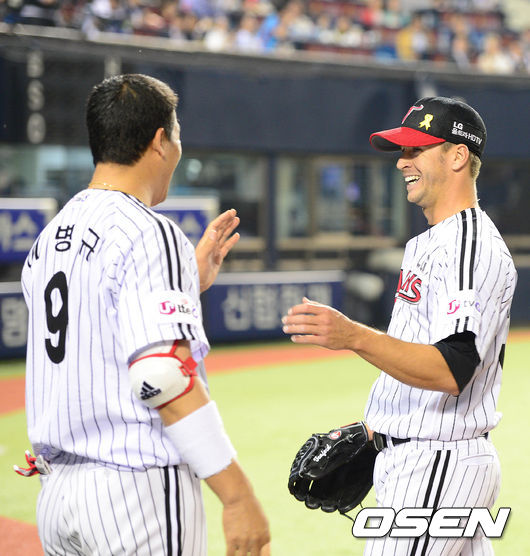 6회초 2사 롯데 박종윤을 삼진으로 처리한 LG 티포드가 더그아웃으로 가며 이병규와 하이파이브를 하고 있다.
