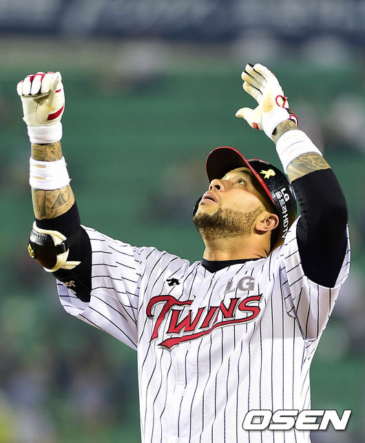 6회말 1사 2루에서 LG 조쉬벨이 우전 적시타를 치고 환호하고 있다.