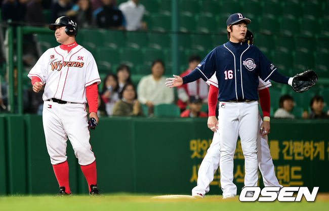 5회말 2사 2,3루 SK 이재원이 박정권의 2루 앞 땅볼때 런다운에 걸려 아웃당한 뒤 아쉬워하고 있다.