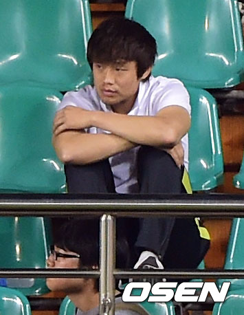 13일 오후 경북 포항시 포항스틸야드에서 진행된 2014 AFC 챔피언스리그 16강 2차전 포항과 전북의 경기 후반, 전반 퇴장 당했던 전북 최보경이 관중석에 앉아서 경기를 지켜보고 있다.