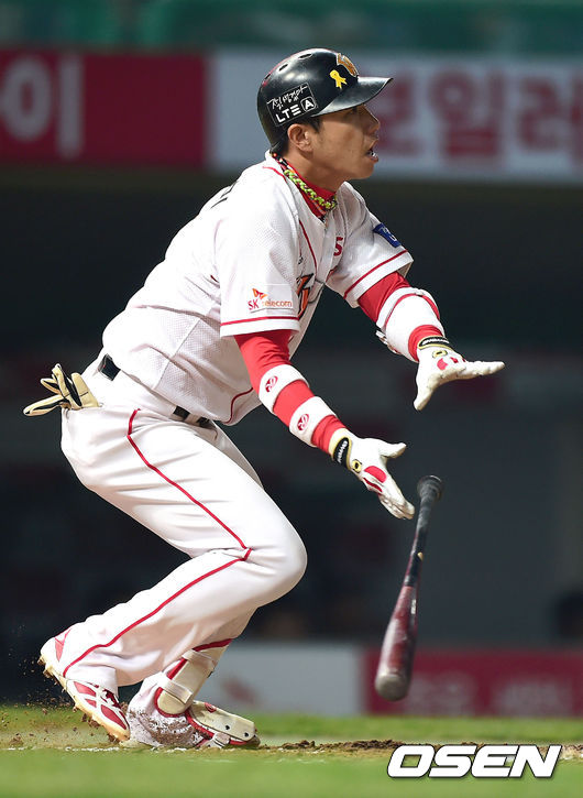 6회말 2사 2루 Sk 김강민이 1타점 적시 2루타를 때리고 있다.